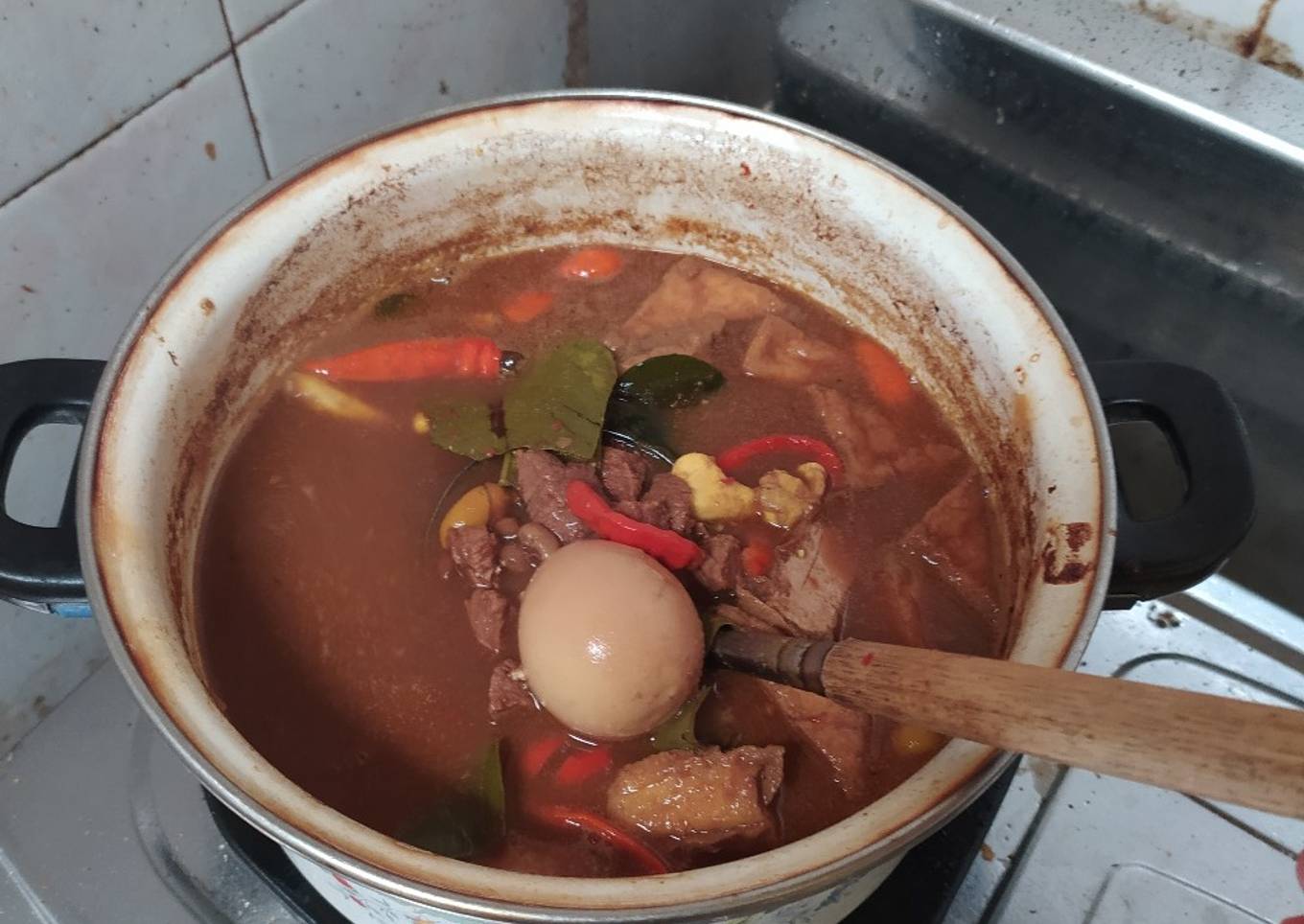 - Jika rebusan kacang tolo sdh menyusut airny,matikan kompor,buang air dan kacang tolo dicampur masukkan direbusan daging.